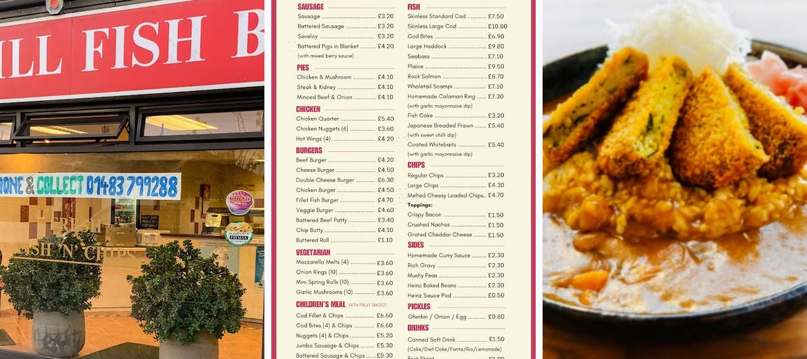Enjoy delicious fish and chips at Knaphill Fish Bar, your local takeaway in Woking. Located at 27 High St, we serve crispy battered cod and flavorful curries, all at great prices. Bring the family for a chat and a meal filled with value and taste! Call us at +44 1483 799288.
