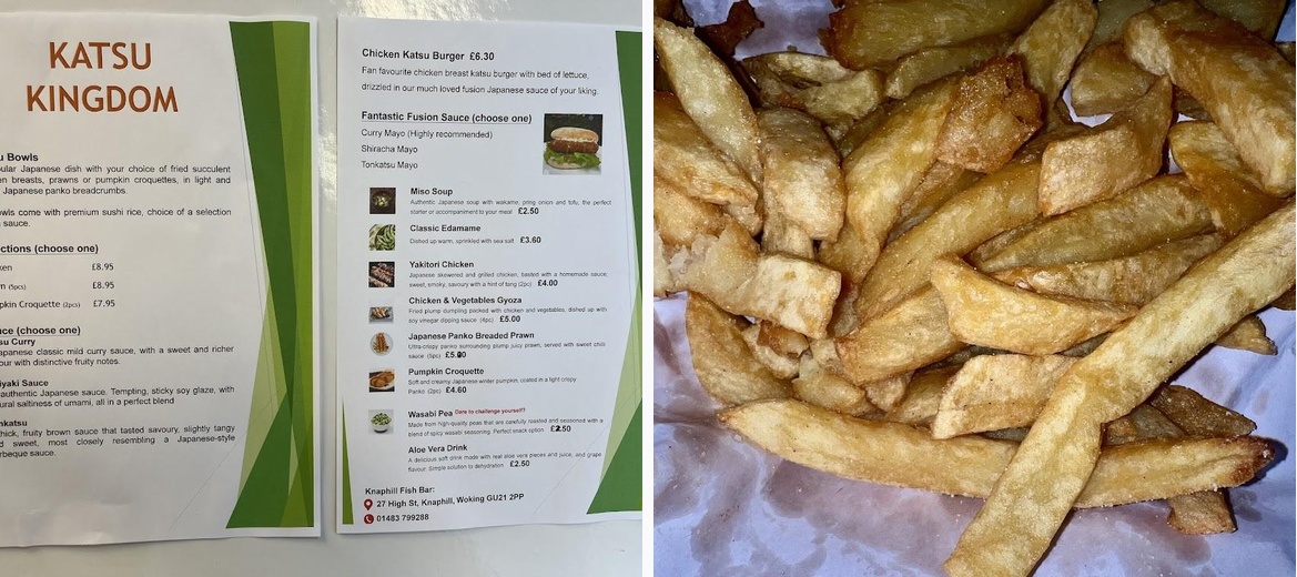 Welcome to Knaphill Fish Bar, your go-to destination for delicious fish and chips and authentic Japanese cuisine in Knaphill, Woking. Perfect for a casual lunch, dinner, or quick bite, we offer a range of halal, vegan, and vegetarian options to satisfy every palate. Enjoy our crispy battered cod alongside a selection of small plates and comfort food. With a friendly, family-oriented atmosphere, we're proud to be a safe space for all. Visit us at 27 High St or call +44 1483 799288 to place your order for takeaway or delivery. Don’t forget to follow us on Instagram and Facebook for the latest updates!Customers highlight the quality of the fish, particularly praising the crispy batter and perfectly cooked varieties, including the sea bass. The double-cooked chips are a standout, featuring a crunchy exterior and fluffy interior. There's an undeniable charm to the friendly service that enhances the overall experience. Diners also appreciate the portion sizes, especially given the reasonable price range between £10 to £20. Unique offerings like cheesy chips and the popular katsu curry create a buzz among regulars, making them favorites worth trying. Overall, the combination of atmosphere, food quality, and friendly staff allows Knaphill Fish Bar to shine in the local food scene.